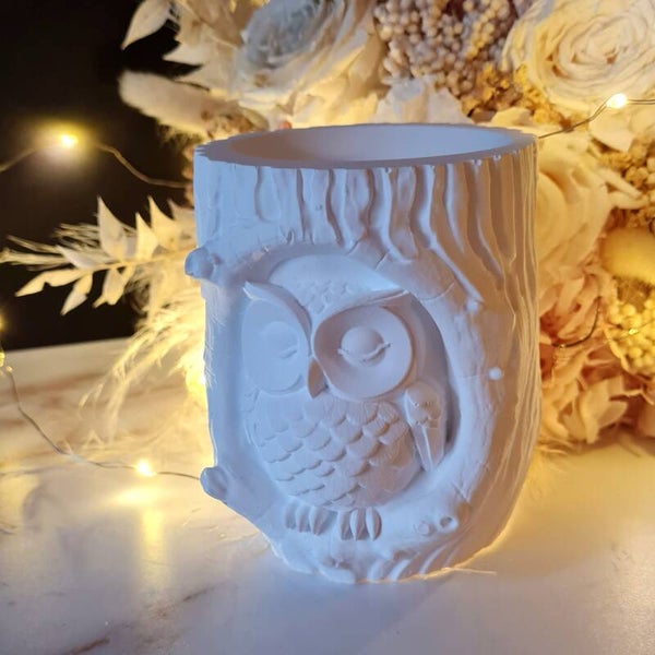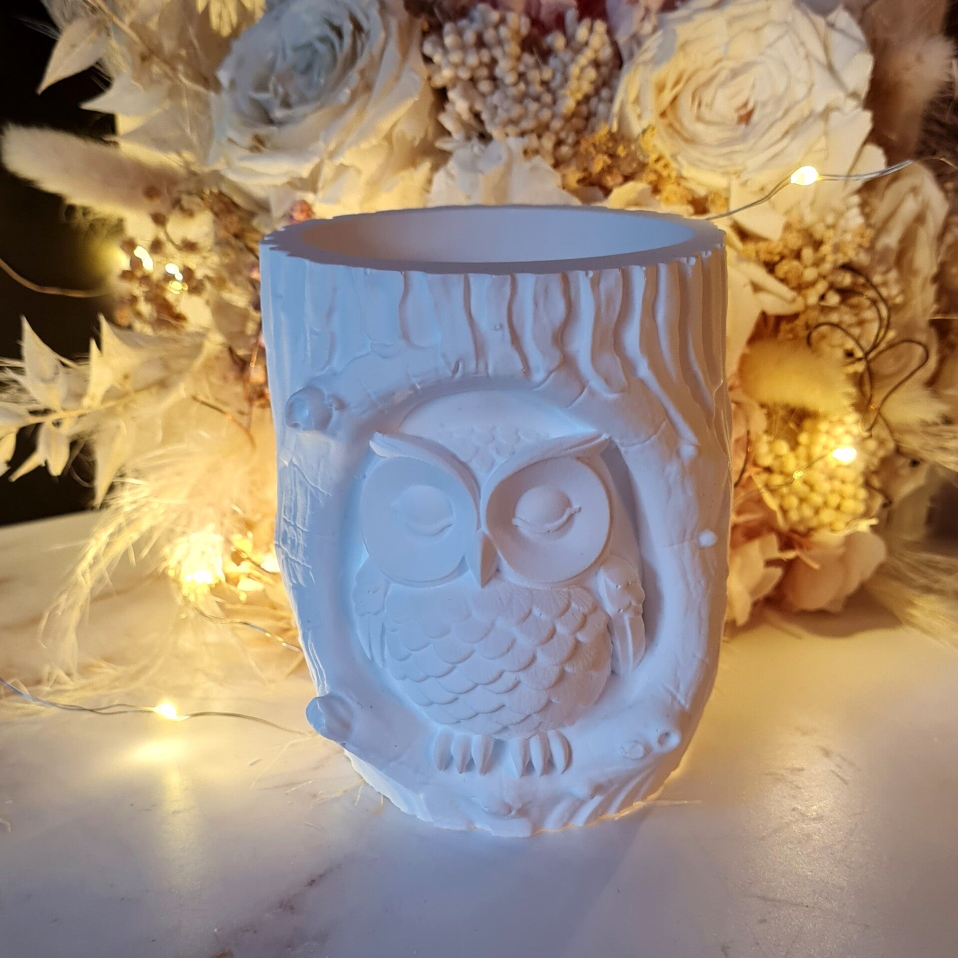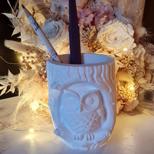 Handgegossener Baumstamm mit 3D-Eule – dekorativer Stiftehalter & Kerzenhalter