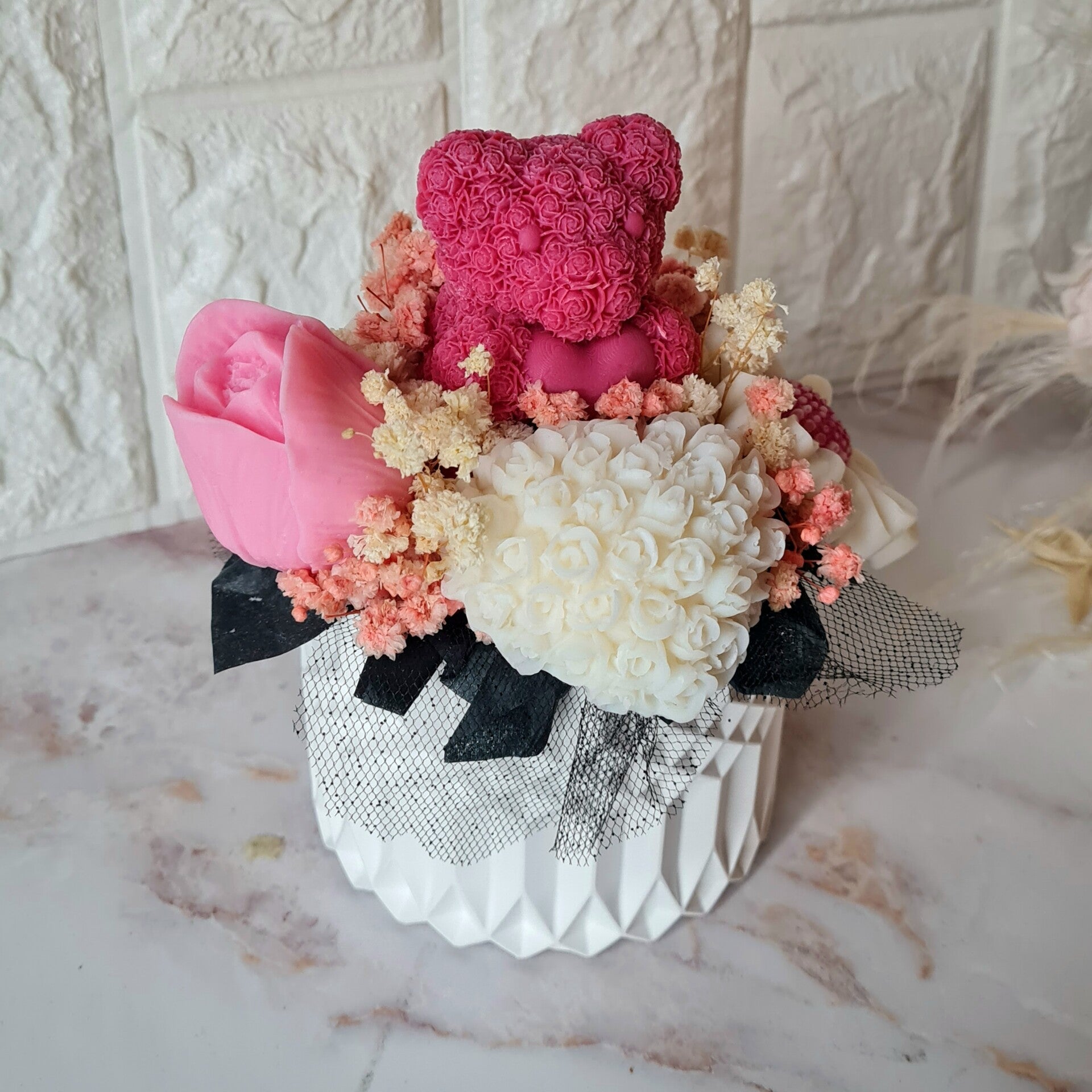 Unser handgemachter Blumenstrauß aus nachhaltigem Sojawachs, veredelt mit getrocknetem Schleierkraut und arrangiert in einem handgegossenen, hochwertigen Keramikgefäß, ist mehr als nur Dekoration – er ist ein emotionales Statement voller Liebe, Wärme und Individualität.
